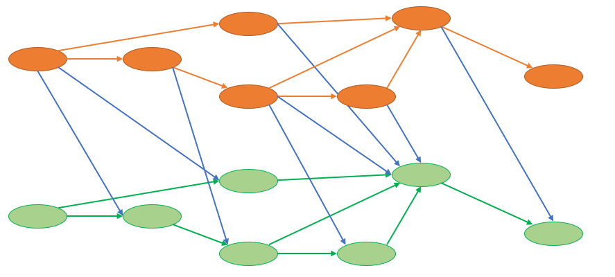 当黄色和绿色的边都是有边权的边时,蓝色是没有边权的边,那么因为所有蓝色边是有向的(在无向图中也是),控制了只跳过k次这个条件,而点相当于是原来的k倍。这样我们直接在新图上跑最短路就可以了(原题卡SPFA)。