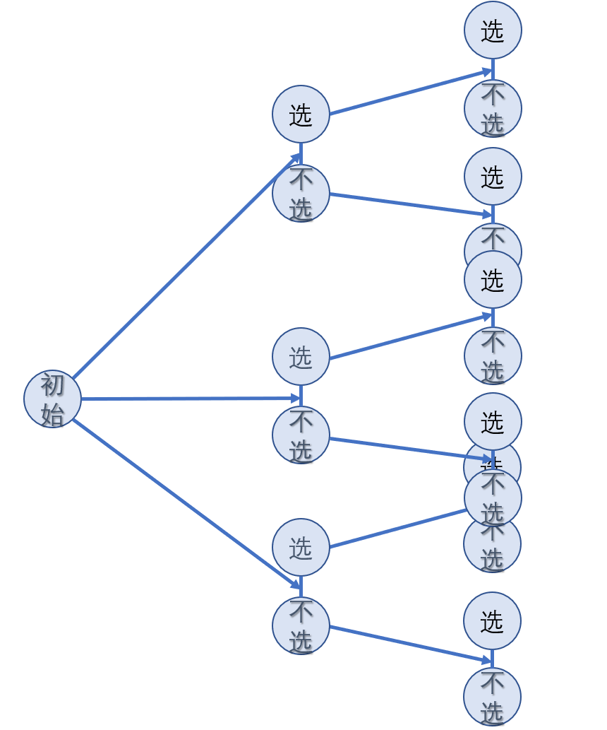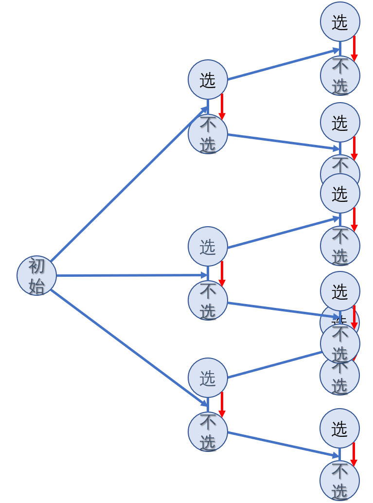 这样看来,每一步的状态只需要判断是否合法,再转移,总的状态还是$ n\times 2^m$。但是合法不合法也是有冲突的,因为我们要控制最大期望,也是我们决策的主导方向,所以有时不选会比选更优。这时前面的选或不选概率就会发生改变,像这样