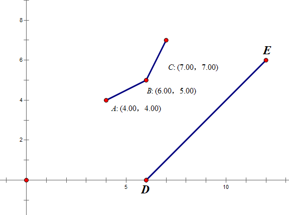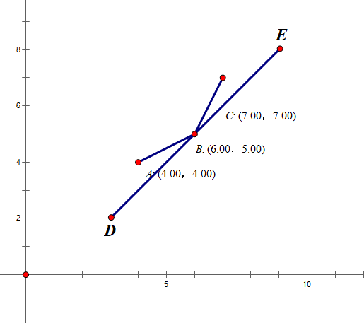 首先,如果有一个点会在某些斜率下被第一个找到,他一定在下凸壳上。也就是说,所有凸壳上的点都可能成为最优解。不过也会有一些不合法的情况,比如右图,A点就是不合法的,因为它不能转移到当前直线表示的状态;所有在B点左侧的点都要舍掉,那么可以发现,在B点左边的点有一个特点:它们所构成的凸壳,边的斜率都比DE的斜率要小。而在原始的状态转移方程中,可以看出f[i]一定是单调增的,所以之后的状态也就只能从B点右侧的点转移了。